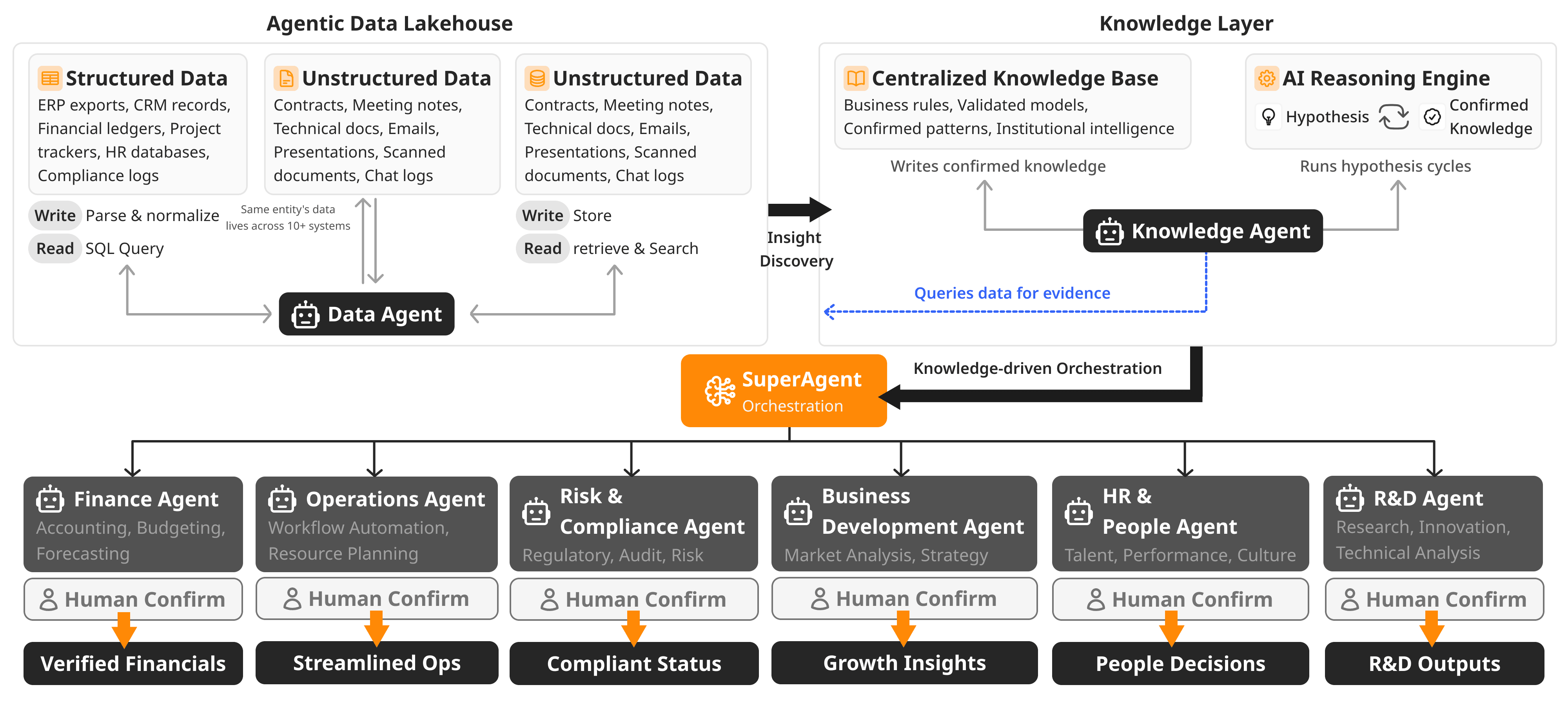 Unified knowledge engine that ingests, cleans, and structures fragmented enterprise data. Vector indexing, schema unification, and semantic search capabilities.